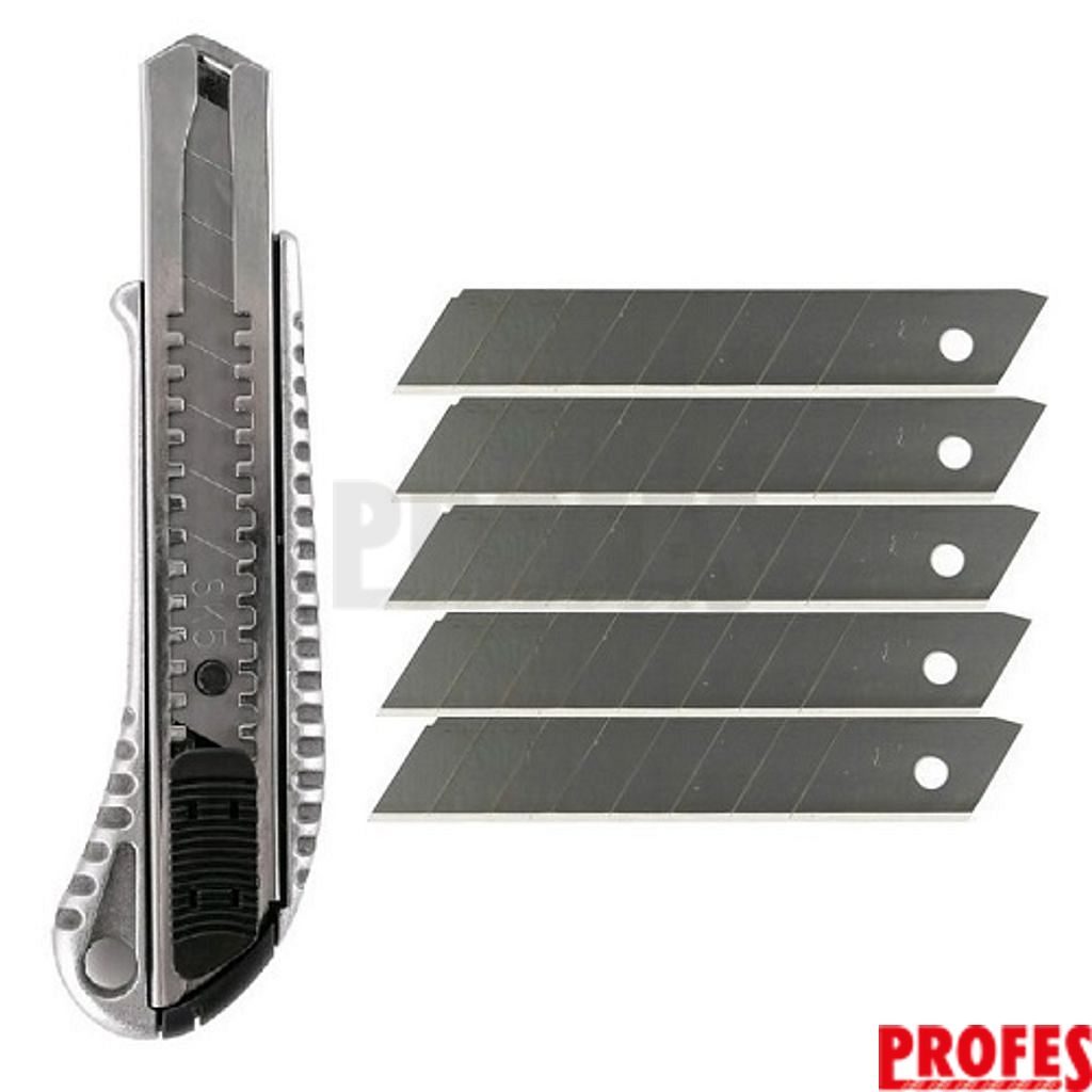 Hliníkový odlamovací nůž s logem CXS, vyroben z kvalitní slitiny, vysunovací s bezpečnostní zarážkou, s ocelovou odlamovací čepelí o šířce 18 mm. Součástí balení je 5 kusů náhradních čepelí.