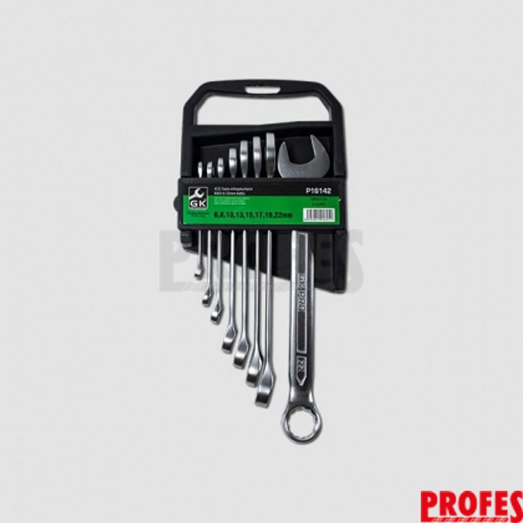 Sada očkoplochých klíčů v plastovém držáku. Klíče jsou z jedné strany ploché otevřené, ze strany druhé je 12-ti hranné očko.Norma -DIN 3113 Materiál- 31CrV3